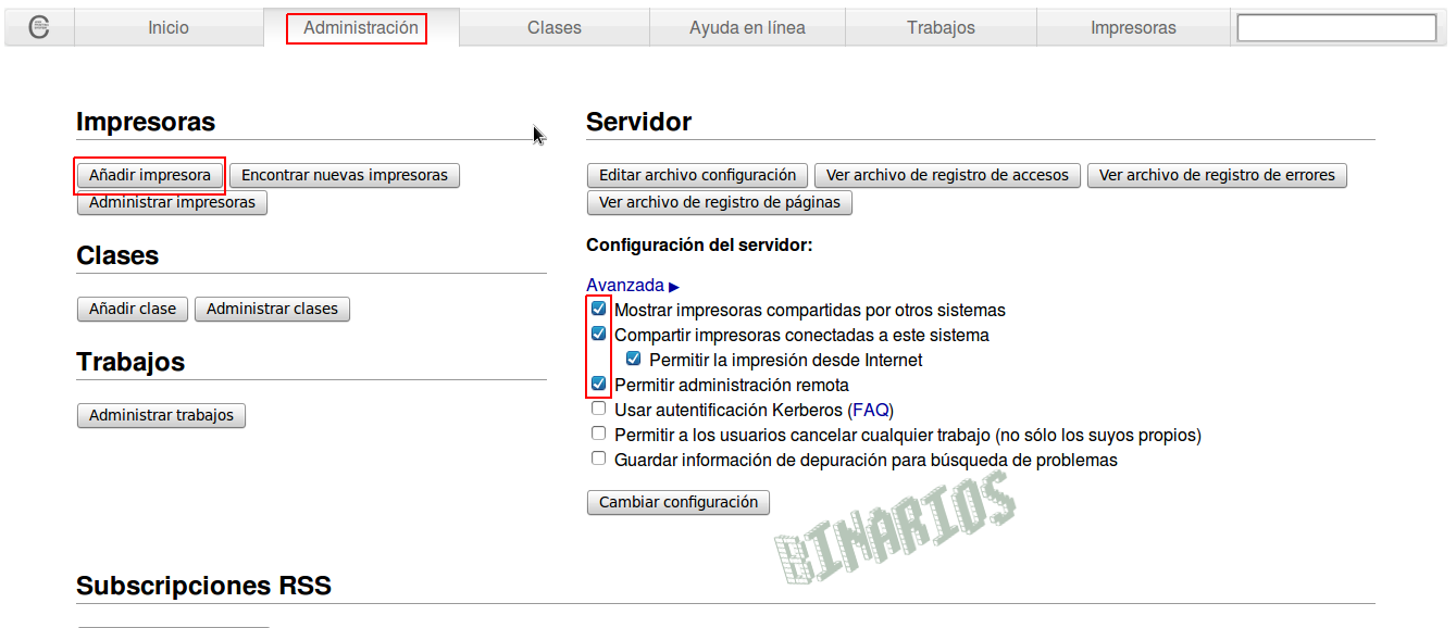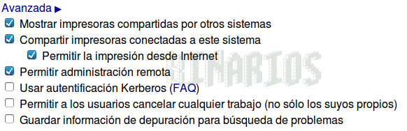 Verificar que el sistema muestre las impresoras compartidas, que comparta las que estén conectadas (opcionalmente se puede decidir si queremos permitir las impresiones desde internet), y por razones de comodidad (inicialmente) seleccionaremos "Permitir administración remota". Luego lo deshabilitaremos.