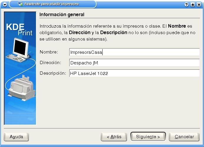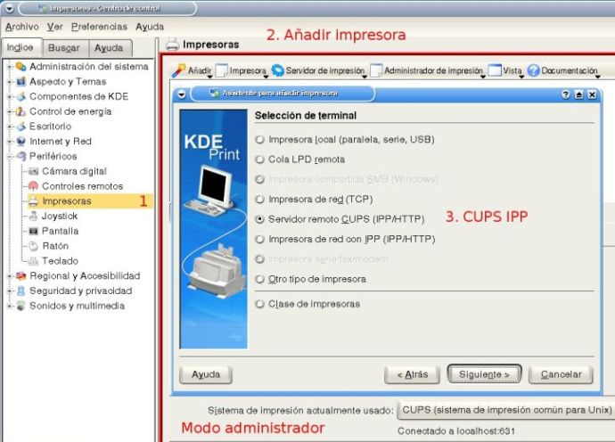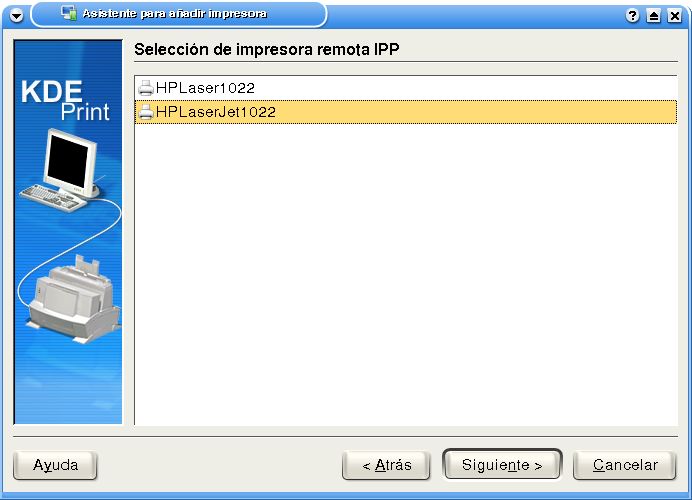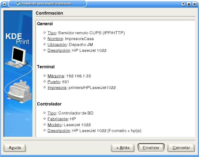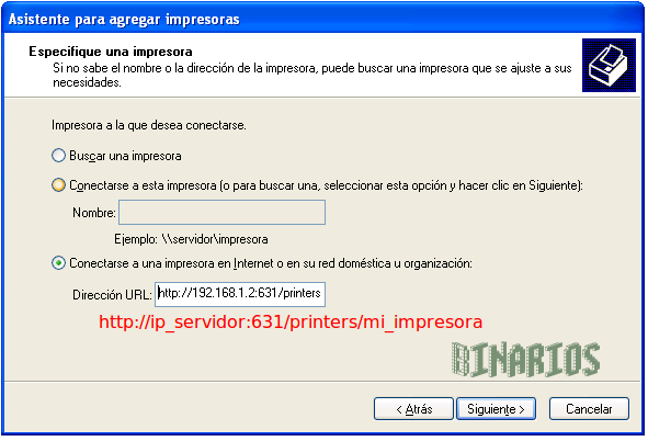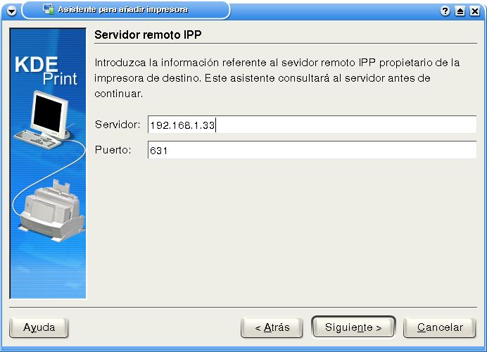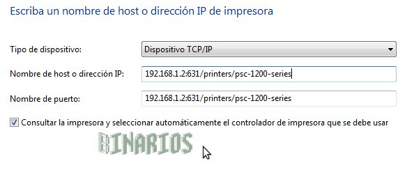 Donde ip_servidor será la IP de la PC que comparte a la impresora. El puerto por defecto que utiliza CUPS es el 631, por lo cual la sintaxis es:
