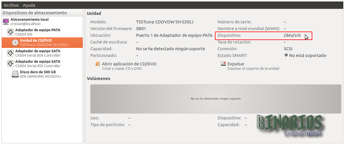 Allí seleccionar la unidad deseada, y buscar el nombre de dispositivo. En este ejemplo /dev/sr0
