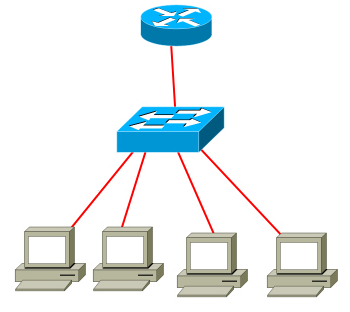 Normalmente las topologías presentes en todos los casos es del tipo "En estrella", en el cual un grupo de computadoras están unidas mediante un switch/router, y de éste eventualmente a Internet, como se ve en la Figura 2.