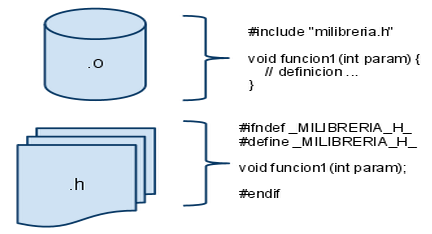 - LIBRERÍA COMPILADA: Se arma un archivo de cabecera (que sólo contiene los prototipos de las funciones) y toda la lógica de ésta se compila en un archivo objeto (oculta).