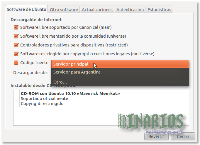 - Cambiar en el listado de repositorio por los oficiales de Canonical (en "Descargar desde")