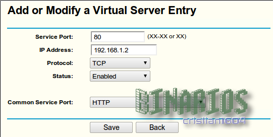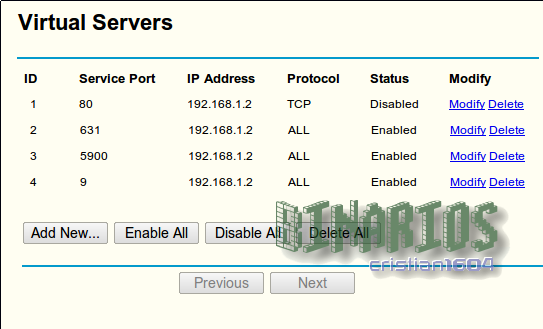 - Accedr a "Fowarding" (también se lo puede llamar "Virtual Servers"). Allí podemos agregar los puertos que necesitemos abrir, además deberemos especificar a qué PC será enviado. Esto implica que las computadoras de la red interna, al menos la PC que prooverá el servicio deberá tener una IP fija.
