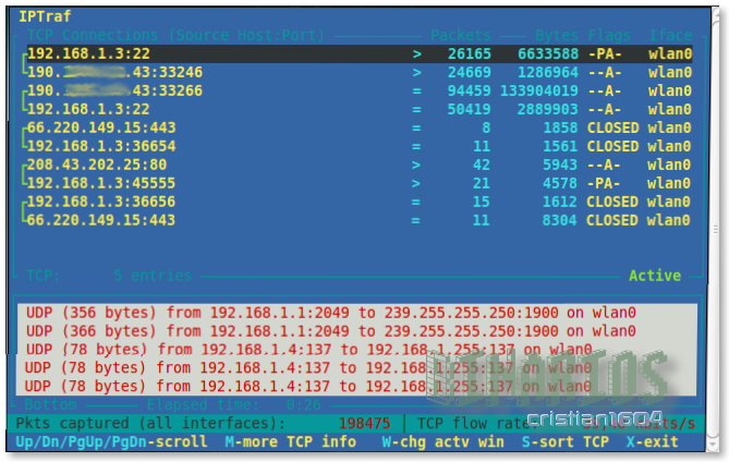 Puedes obtener toda la información acerca de la red con iptraf. Sabrás las conexiones entrantes y salientes, IPs a las que estás conectado, puertos y mucha más información. Es recomendado si te gusta auditar constantemente las redes a las que estas conectado. Puedes ver toda la información aquí.