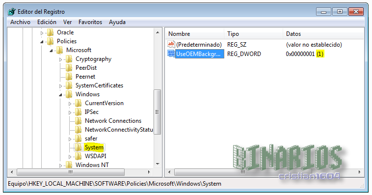 Y modificar en la clave OEMBackground, el valor 0 por 1. Si no existe, la creamos así: