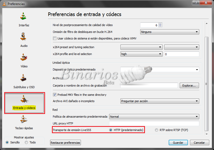 En primer lugar ejecutar VLC e ir a las opciones. (Menú Herramientas -> Preferencias, o Ctrl + P) y en el menú de la izquierda, seleccionar Entrada y Códecs. En la sección Red, tildamos la opción HTTP en Transporte de emisión Live555, tal como se ve en la siguiente captura: