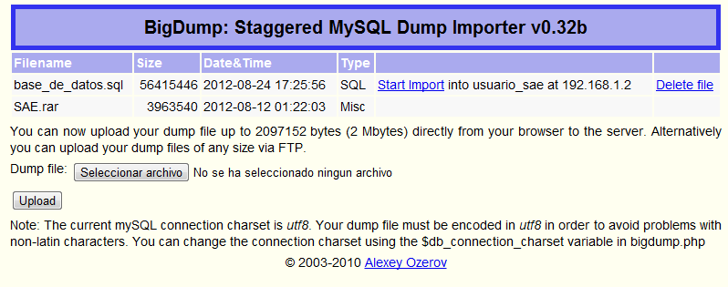 Presten especial atención a la línea 14 donde la cadena de caracteres (o cotejamiento) está establecida en UTF8. Descargando bigdump desde Binarios ya está por defecto este cotejamiento.