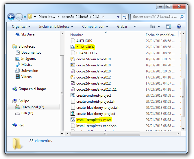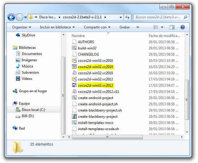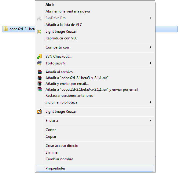 Una vez completada la instalación de Visual C++, descomprimir el contenido de cocos2d-x en algún directorio, por ejemplo en el C:\