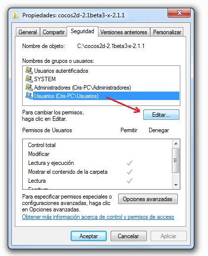 Para corregir el problema de permisos debemos otorgarle a las carpetas donde están instalados Microsoft Visual Studio y Cocos2D-X permisos completos para nuestra cuenta de usuario de Windows.