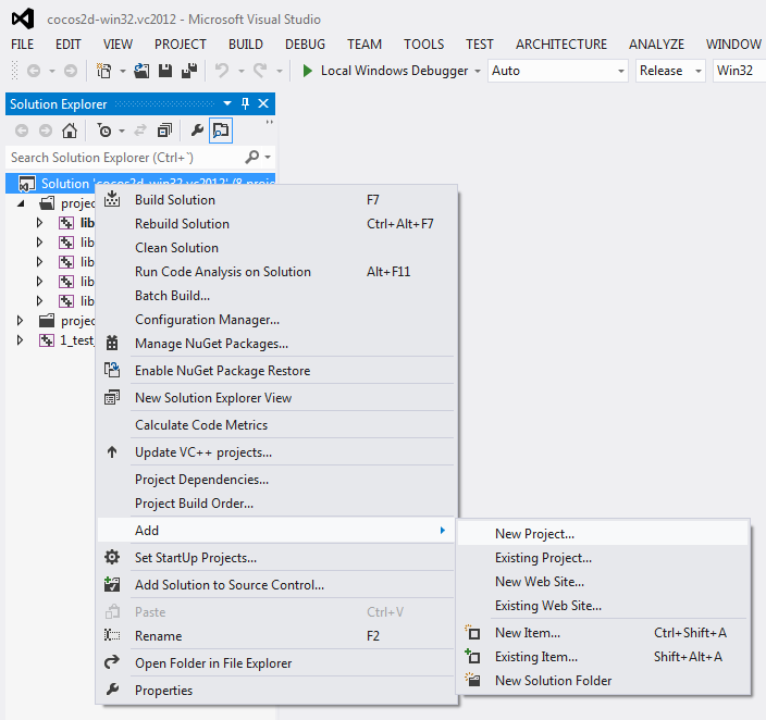 Sobre el proyecto de Cocos2D-X click con el botón derecho -> Add (nuevo) -> New Project (Nuevo proyecto).