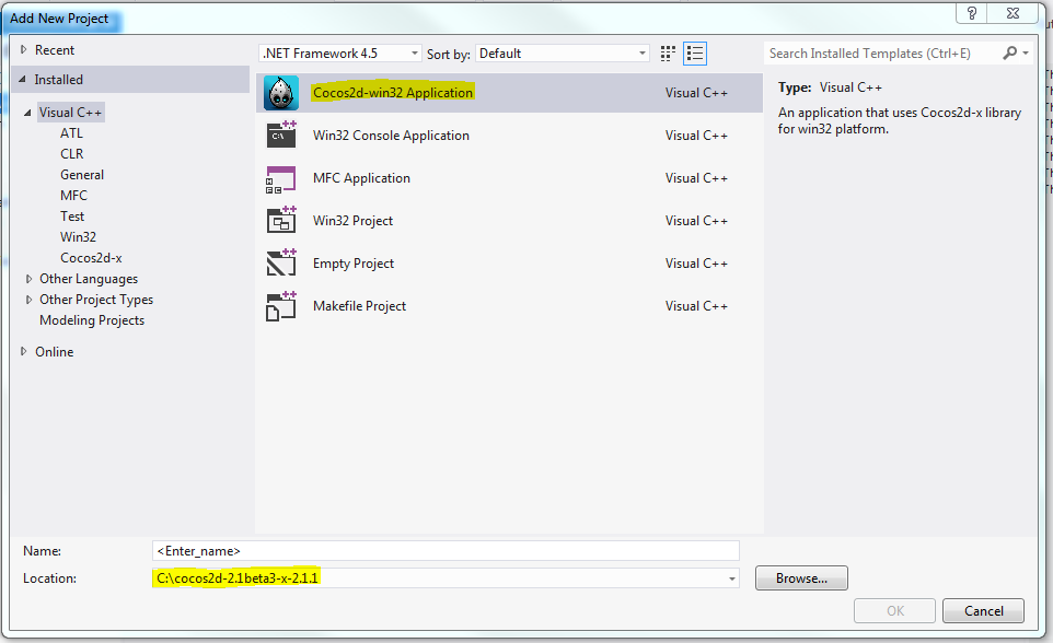 En la nueva ventana que se abrirá, seleccionamos el item que dice Cocos2d-win32 Application.