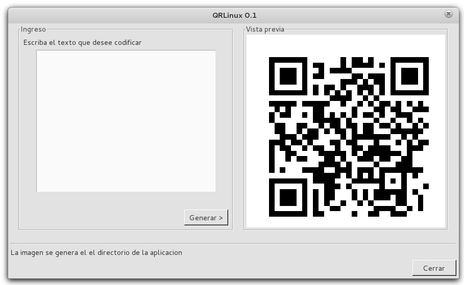 QRLinux es es un front end para Linux que emplea software de terceros (libqrencode) para generar imágenes de alta resolución para ser impresas o utilizadas para cualquier fin.