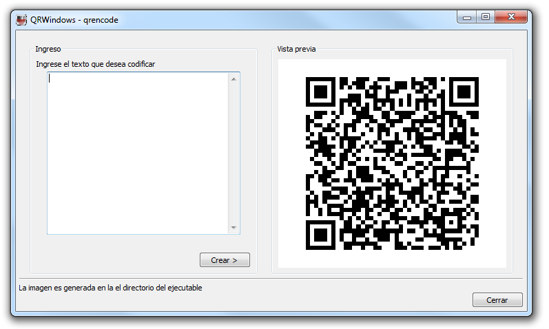 QRWindows es es un front end para Windows que emplea software de terceros (libqrencode 3.3.1) para generar imágenes de alta resolución para ser impresas o utilizadas para cualquier fin.
